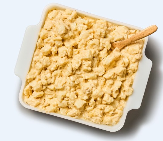 Baked potatoes filled with creamy mashed potatoes, topped with bacon, cheddar cheese & scallions.